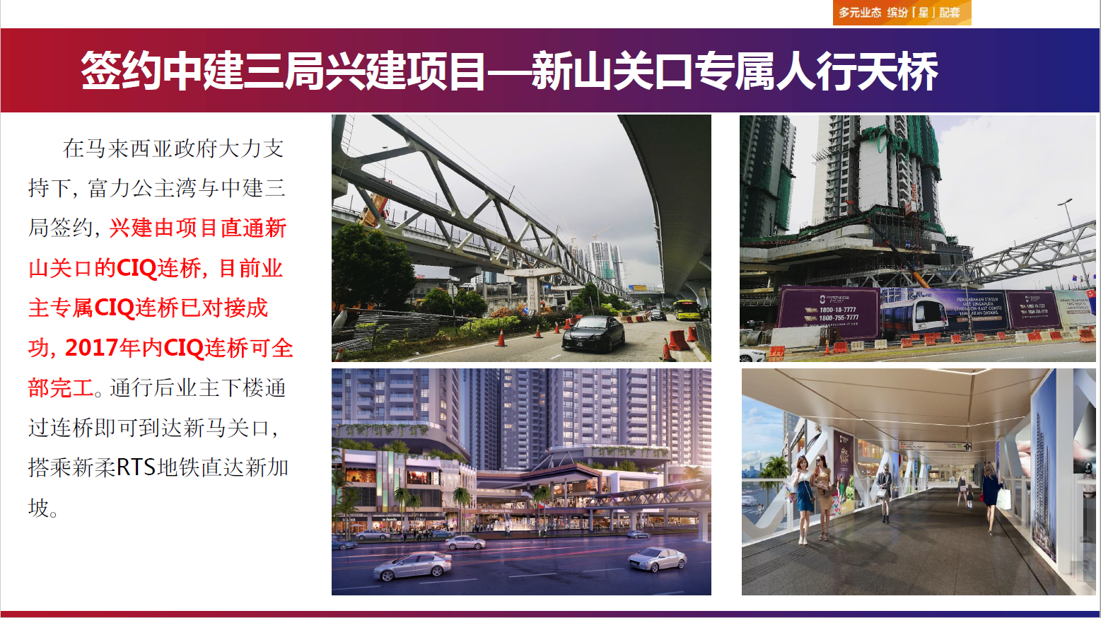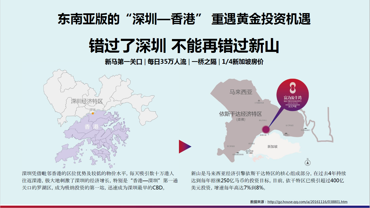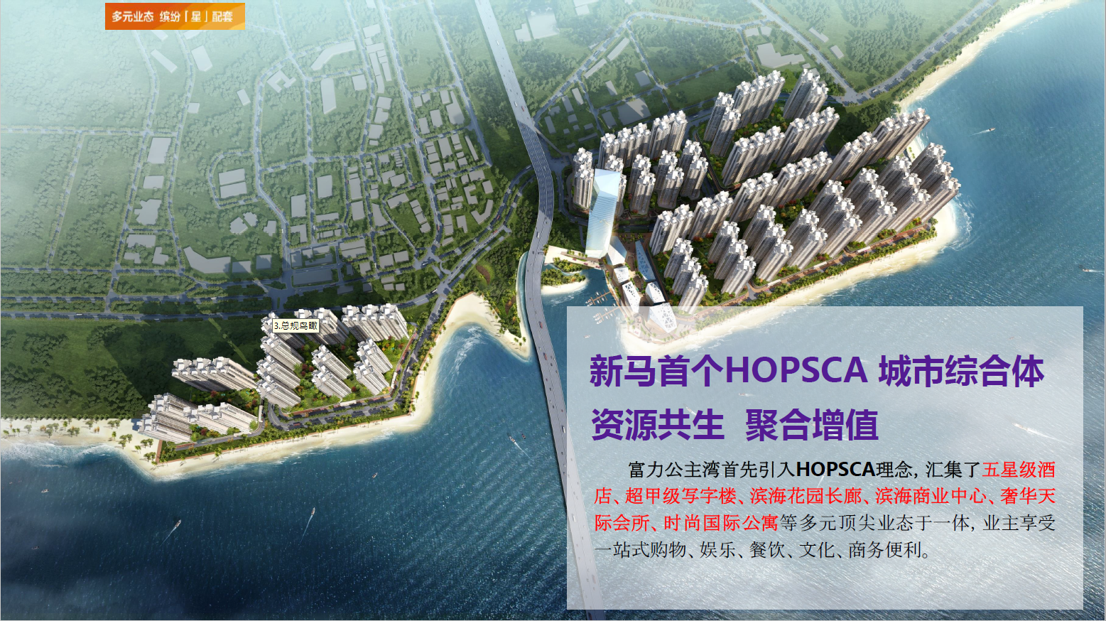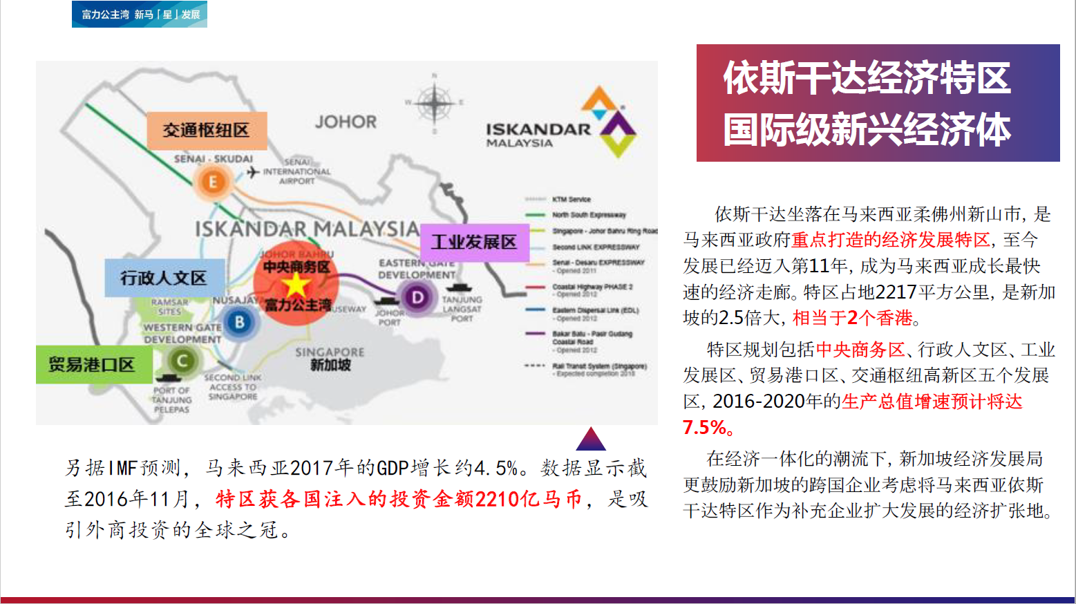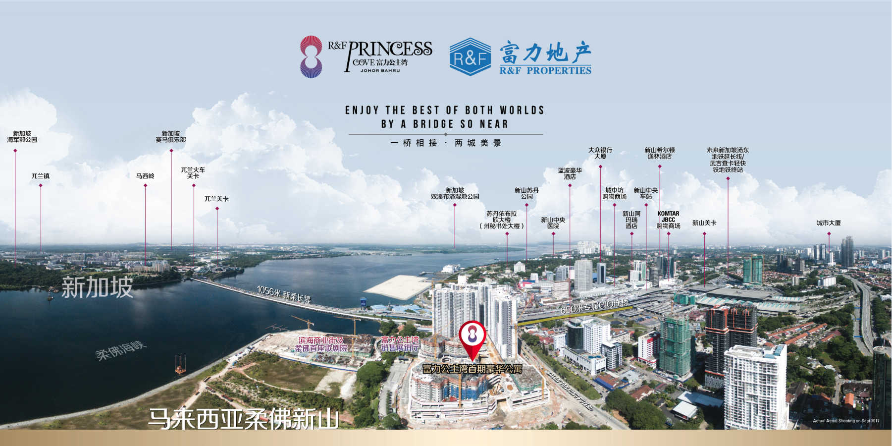 富力公主灣是富力地產斥資85億在新馬第一關口打造的新馬國門地標。富力公主灣總占地約44萬㎡,總建築面積約300萬㎡。彙集了五星級酒店、超甲級寫字樓、濱海花園長廊、濱海商業中心、奢華天際會所、時尚國際公寓等多元頂尖業態為一體,建成後將是全球距離新加坡最近的超大型HOPSCA國際濱海綜合體。項目位於馬來西亞的柔佛巴魯市,與全球四大金融中心之一的新加坡一橋之隔,只有1056米的距離。而專案所在的柔佛巴魯市位於馬來西亞國家級經濟特區---依斯干達經濟特區境內,它與旁邊一衣帶水的新加坡的關係就好像是“深圳與香港”的關係一樣。