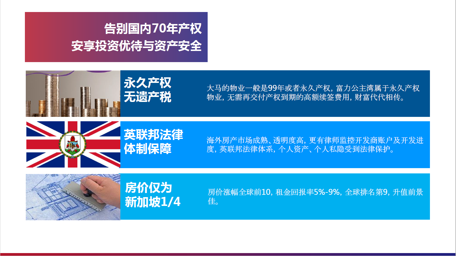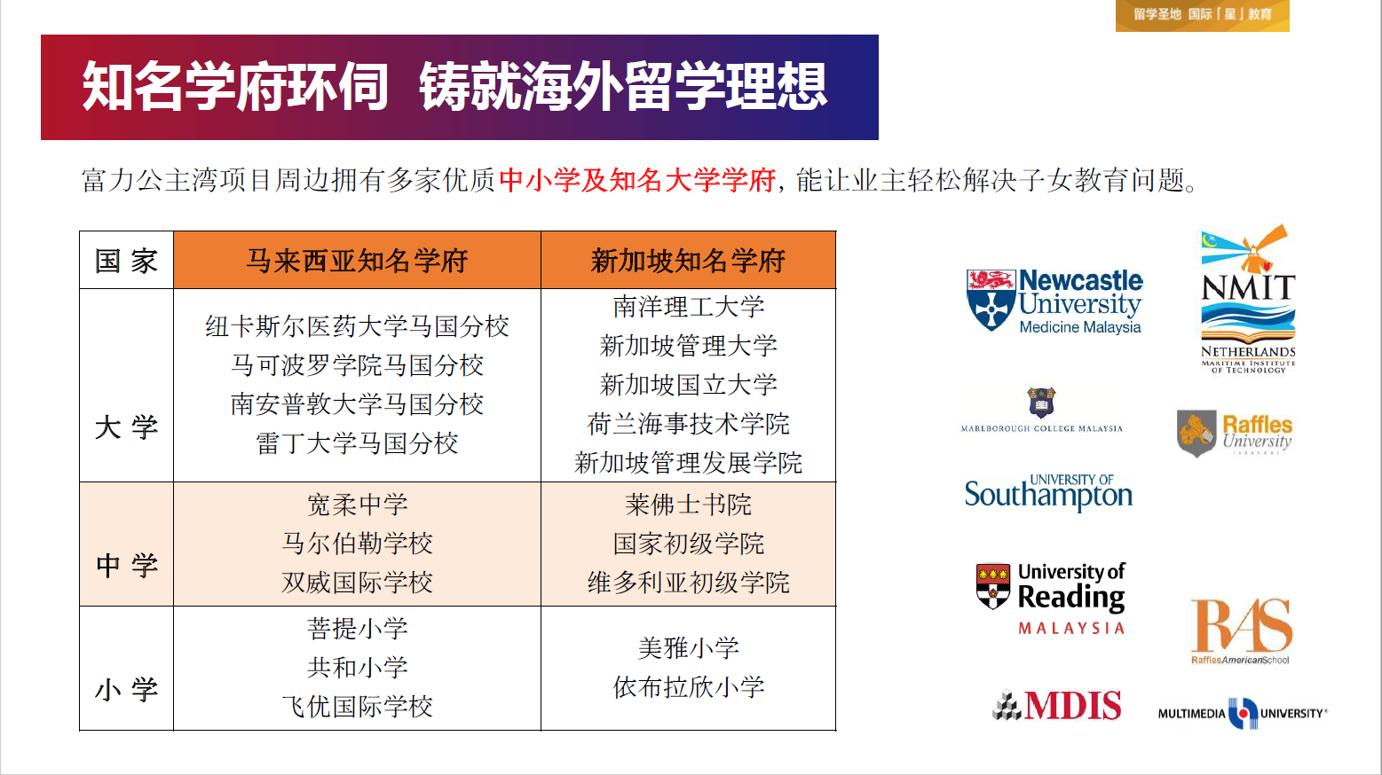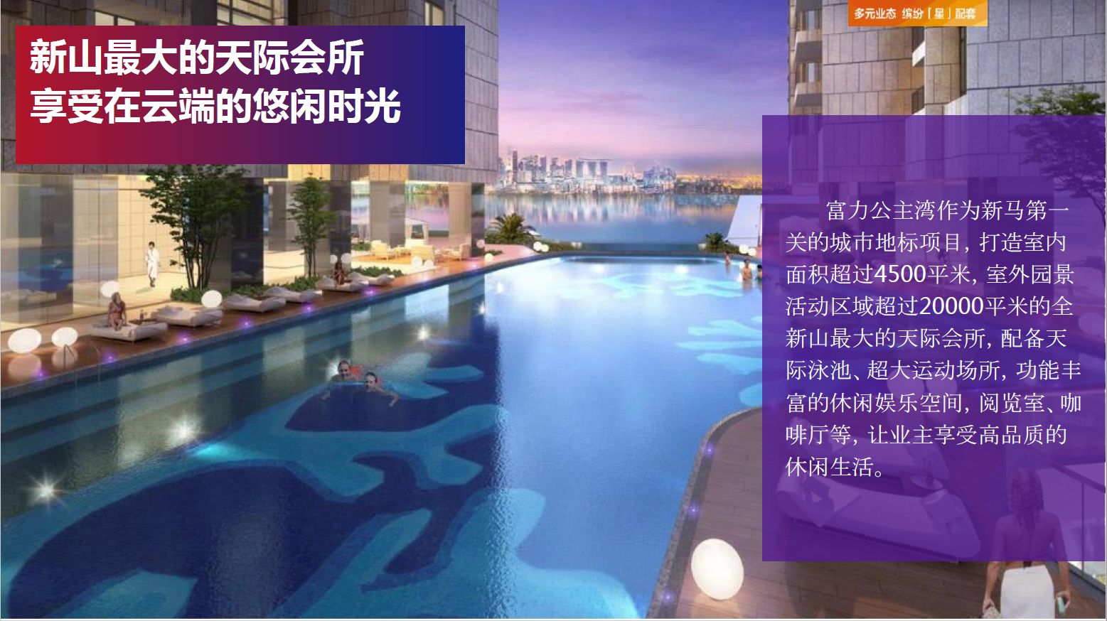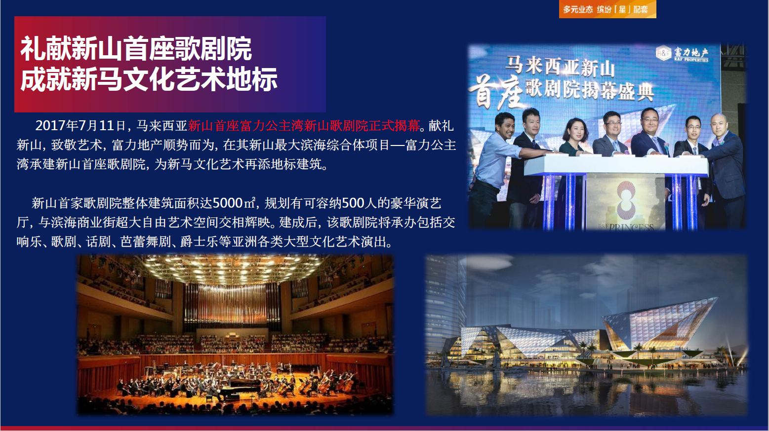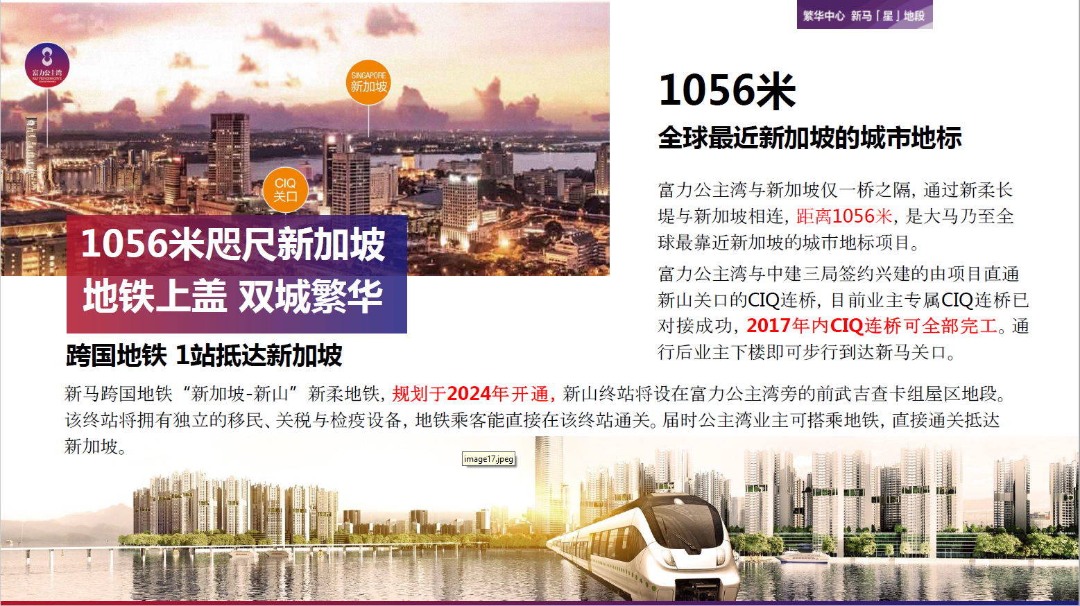 富力公主灣是富力地產斥資85億在新馬第一關口打造的新馬國門地標。富力公主灣總占地約44萬㎡,總建築面積約300萬㎡。彙集了五星級酒店、超甲級寫字樓、濱海花園長廊、濱海商業中心、奢華天際會所、時尚國際公寓等多元頂尖業態為一體,建成後將是全球距離新加坡最近的超大型HOPSCA國際濱海綜合體。項目位於馬來西亞的柔佛巴魯市,與全球四大金融中心之一的新加坡一橋之隔,只有1056米的距離。而專案所在的柔佛巴魯市位於馬來西亞國家級經濟特區---依斯干達經濟特區境內,它與旁邊一衣帶水的新加坡的關係就好像是“深圳與香港”的關係一樣。
